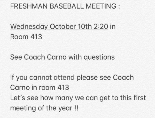 Freshman Baseball meeting On October 8, 2018 By mrcarnoIn Uncategorized Share this: Click to share on X (Opens in new window) X Click to share on Facebook (Opens in new window) Facebook Like Loading...