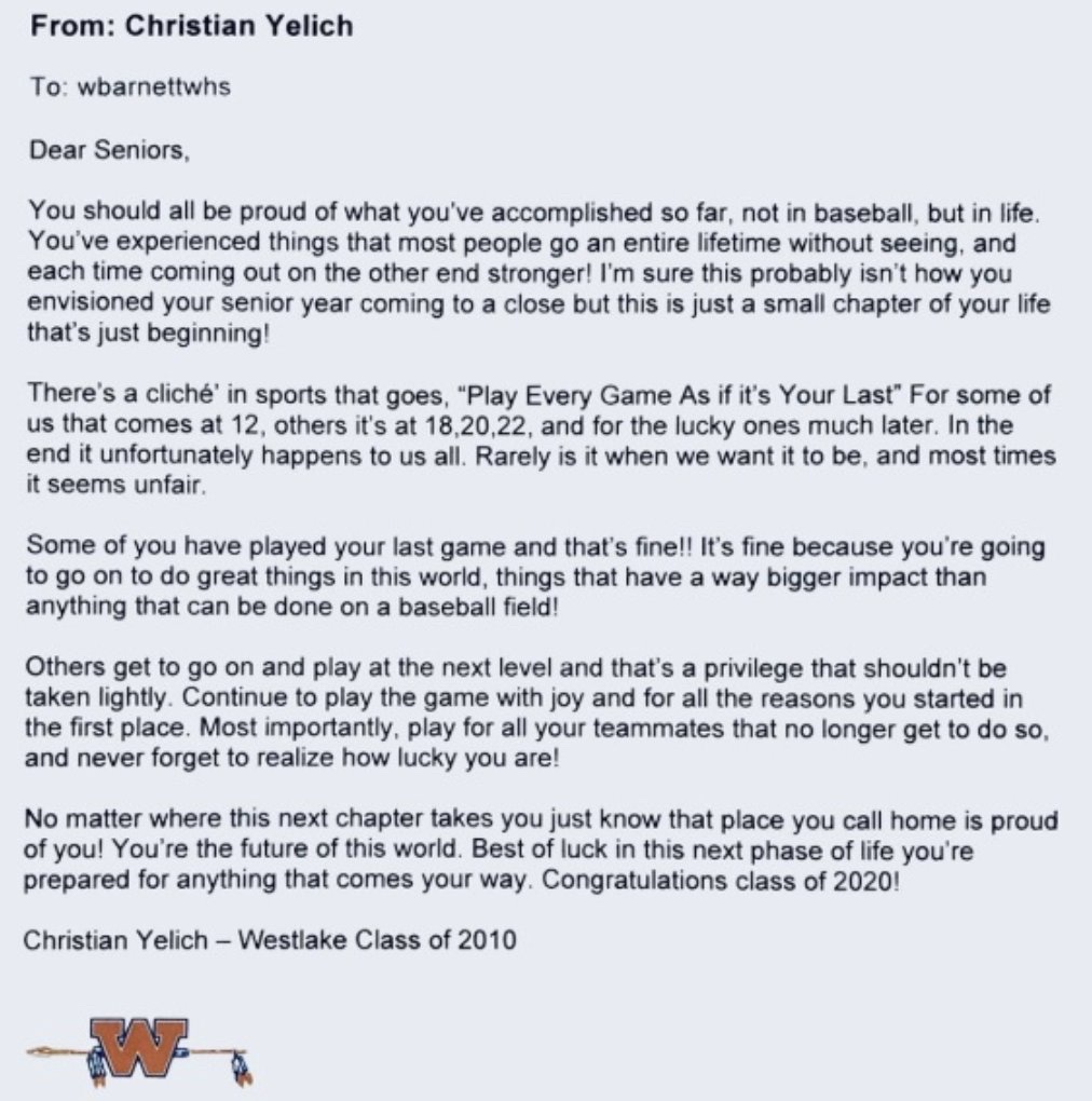 I couldn’t have put it in better words ! Christian Yelich to seniors at his alma mater On April 12, 2020 By mrcarnoIn Uncategorized Share this: Click to share on X (Opens in new window) X Click to share on Facebook (Opens in new window) Facebook Like Loading...