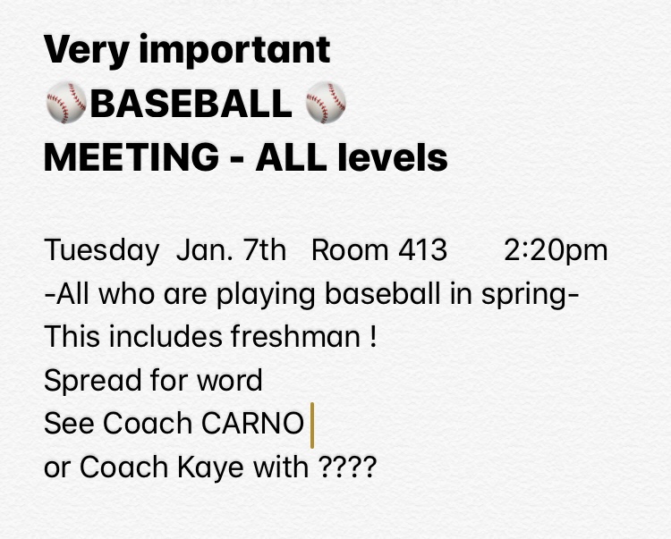 Baseball will have a last preseason meeting for ALL LEVELS WEDNESDAY March 4 at 2:20pm on in room 413. It will take 15 min – see coach carno if you can’t attend